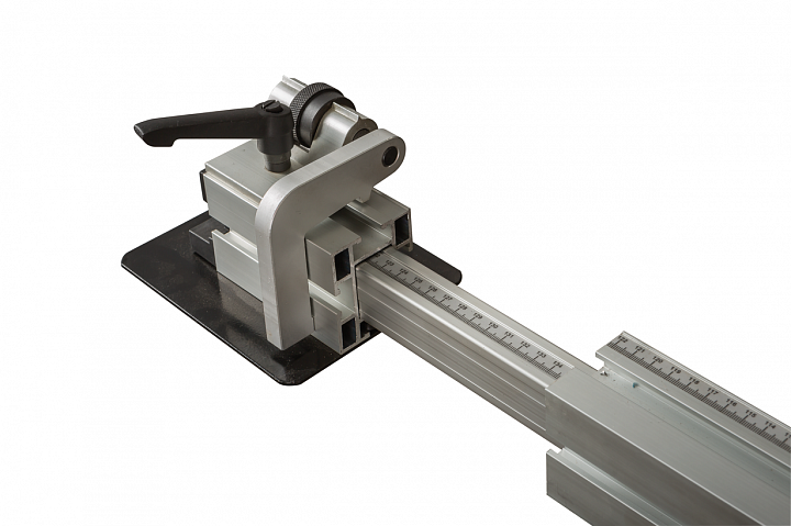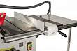 Рабочий стол выполнен из чугунного литья, его можно расширить одной или двумя секциями. Первым ставится чугунный расширитель, к нему можно пристыковывать сегмент из стального листа, оборудованный опорой. Такая база позволяет распиливать детали с отступом 1220 мм от параллельного упора. Сам упор выполнен по классической для профессиональных станков схеме: крепится к массивному чугунному основанию, которое перемещается по цилиндрической направляющей и фиксируется эксцентриковым стопором.