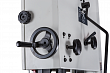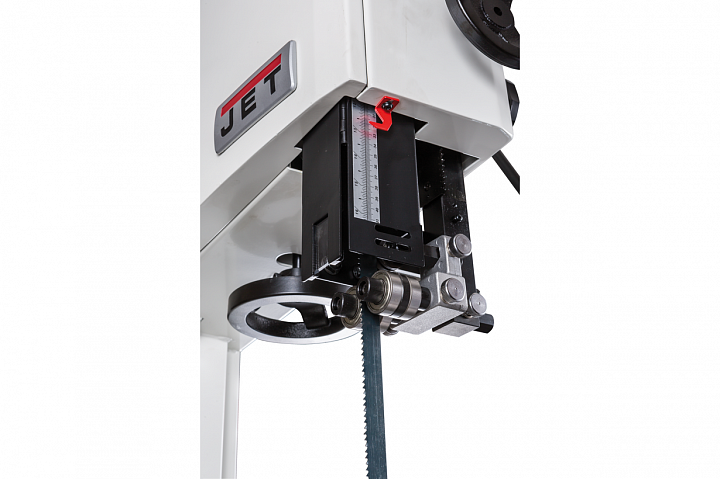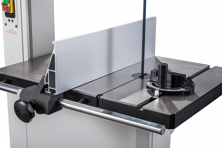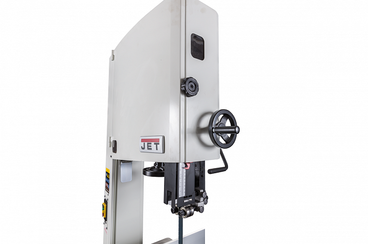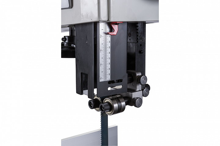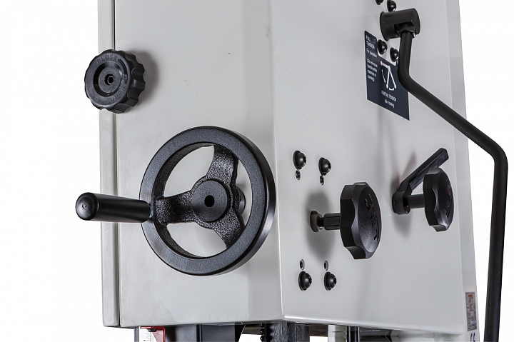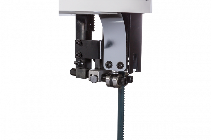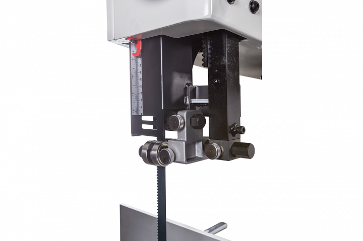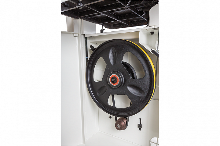 Механизм натяжения и центрирования ленты включает в себя две группы трехроликовых направляющих на шарикоподшипниках, стрелочный индикатор уровня натяжения, регулирующие маховики, два смотровых окошка и рычаг быстрого натяжения-ослабления. Он не совсем обычен, поскольку имеет не два, а три фиксированных положения: рабочее (плотно натянуто), для хранения (лента ослаблена, но держится на шкивах) и сервисное (для замены полотна). Чтобы улучшить плавность работы, использованы чугунные шкивы с массивным телом, а не в виде спицованных колес, как раньше.